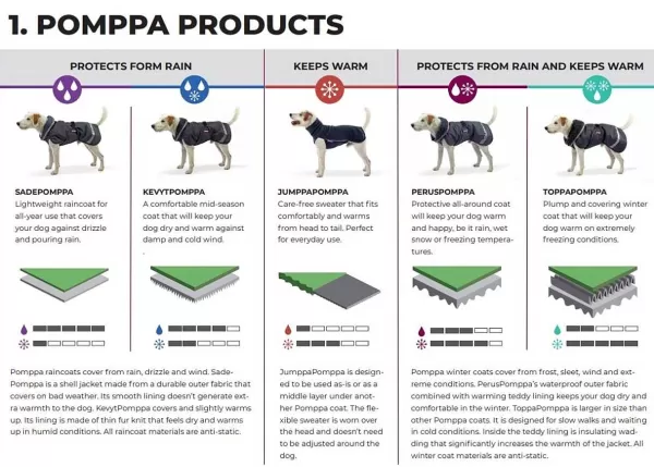Kevytpomppa Is Een Tussenseizoenjas Die De Hond Warm En Droog Houdt Bij Nat En Koud Weer. Het Ontwerp En De Maatvoering Van Kevytpomppa, Evenals De Waterdichte En Duurzame Buitenstof, Zijn Hetzelfde Als Die Van Peruspomppa. De Binnenvoering Is Gemaakt Van Dunne Synthetische Stof, Dat Zacht En Antistatisch Is. Kevytpomppa Is Gemakkelijk Op Te Bergen En Biedt Goede Bescherming Als Het Weer Tijdens De Wandeling Opeens Slecht Wordt.