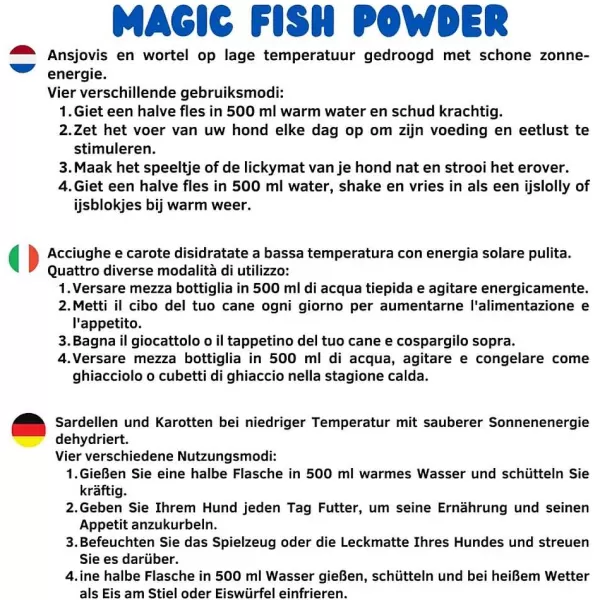 Anjovis En Wortel Op Lage Temperatuur Gedehydrateerd Met Schone Zonne-Energie. Vier Verschillende Gebruiksmodi: 1. Giet Een Halve Fles In 500 Ml Warm Water En Schud Hard. 2. Strooi Het Over Je Dagelijkse Eten Om Het Aantrekkelijker Te Maken. 3. Maak Je Speeltje Of Likmat Nat En Strooi Het Erover. 4. Giet Een Halve Pot In 500 Ml Water, Schud En Vries In Als Brokken Of Blokjes Voor Warm Weer.
