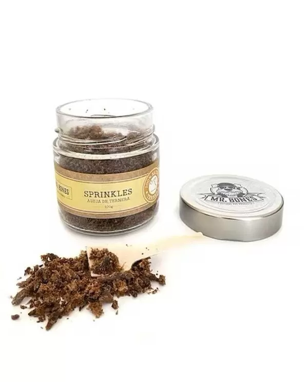 De Sprinkles Van Mr. Bones Zijn Gemaakt Van 100% Natuurlijk Vlees En Vis, Gedroogd Bij Een Lage Temperatuur Om Alle Voedingsstoffen Te Behouden En Geplet Tot Een Zeer Fijne Korrelige Textuur Is Verkregen.